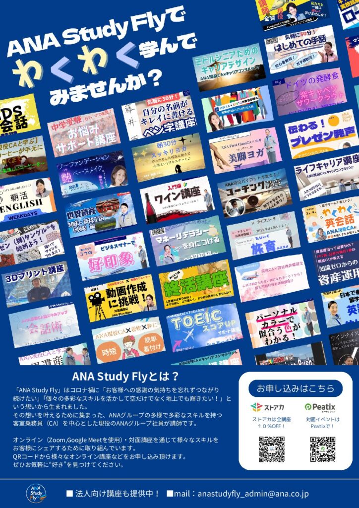 ANA Study Fly は、現役ANA社員一人ひとりが持つスキルや経験を活かし、個人の学びから、企業・組織の変化までを支援するサービスです。